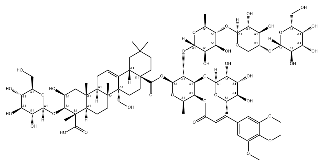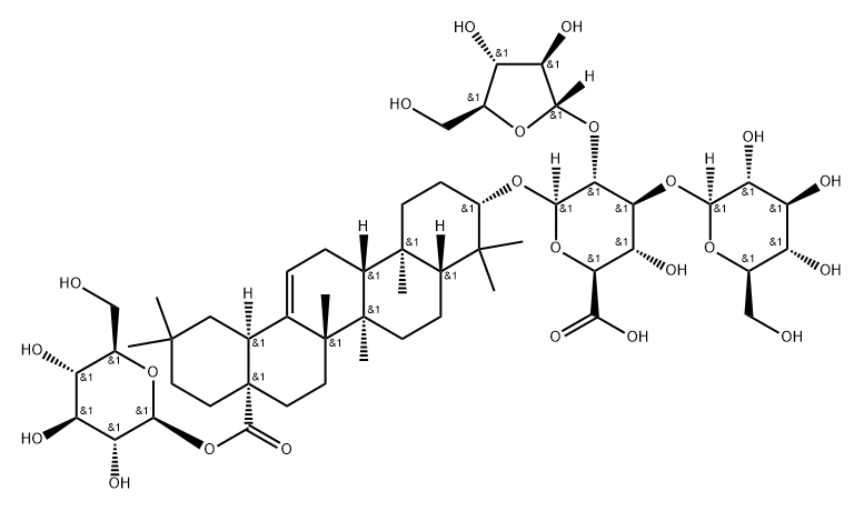Olean-12-en-28-oic acid, 3-[(6-O-β-D-glucopyranosyl-β-D-glucopyranosyl)oxy]-2,16,23-trihydroxy-, O-D-apio-β-D-furanosyl-(1→3)-O-β-D-xylopyranosyl-(1→4)-O-6-deoxy-α-L-mannopyranosyl-(1→2)-α-L-arabinopyranosyl ester, (2β,3β,4α,16α)- Olean-12-en-28-oic acid, 3-[(6-O-β-D-glucopyranosyl-β-D-glucopyranosyl)oxy]-2,16,23-trihydroxy-, O-D-apio-β-D-furanosyl-(1→3)-O-β-D-xylopyranosyl-(1→4)-O-6-deoxy-α-L-mannopyranosyl-(1→2)-α-L-arabinopyranosyl ester, (2β,3β,4α,16α)- 849758-44-7 C63H102O32